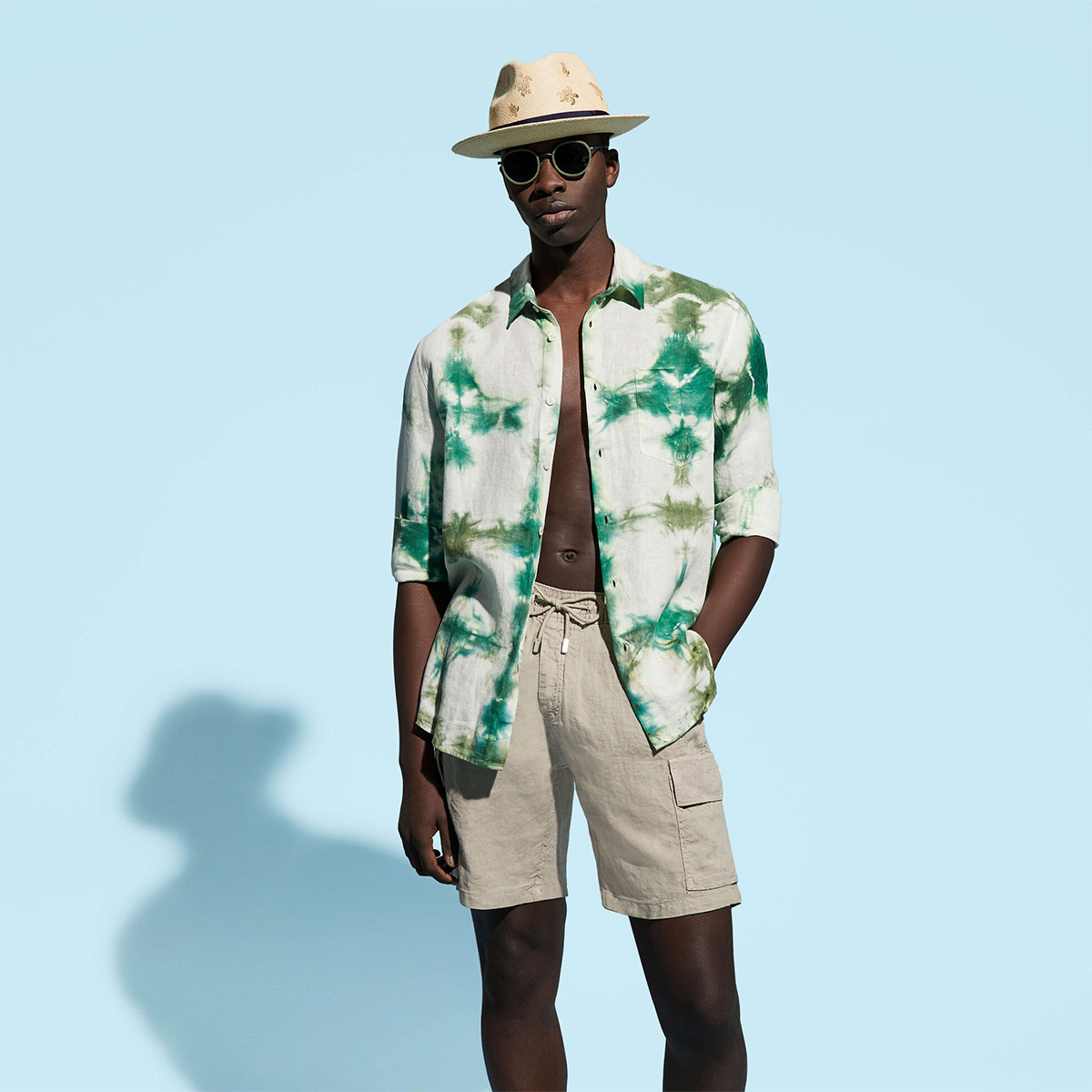 Esnek ve rahat keten kumaştan üretilen, zamansız ve rahat erkek bermuda şortları, Vilebrequin koleksiyonunun önemli bir parçasıdır.