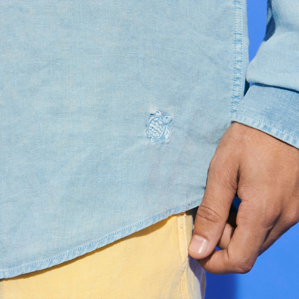 Caroubis uzun kollu keten gömlekler, Vilebrequin’in St Tropez’den ilham alan stilini klasik, sade bir kesimle gösteriyor. Yumuşak keten kumaştan yapılmış bu gömlek, eteğinde aynı tonda işlenmiş ikonik kaplumbağa logosu ile dikkat çekiyor.