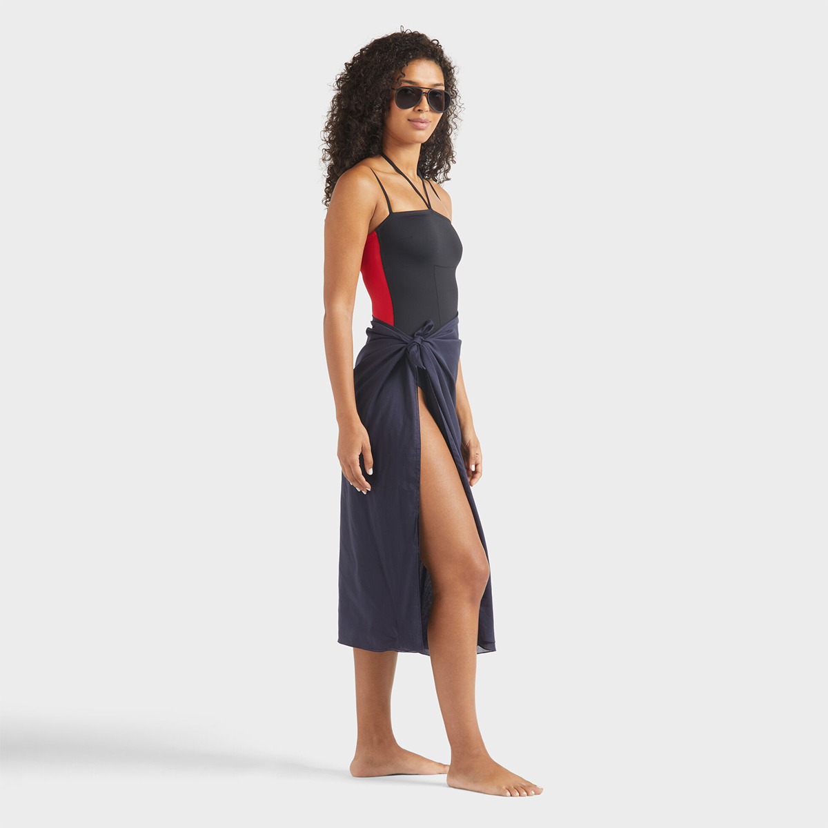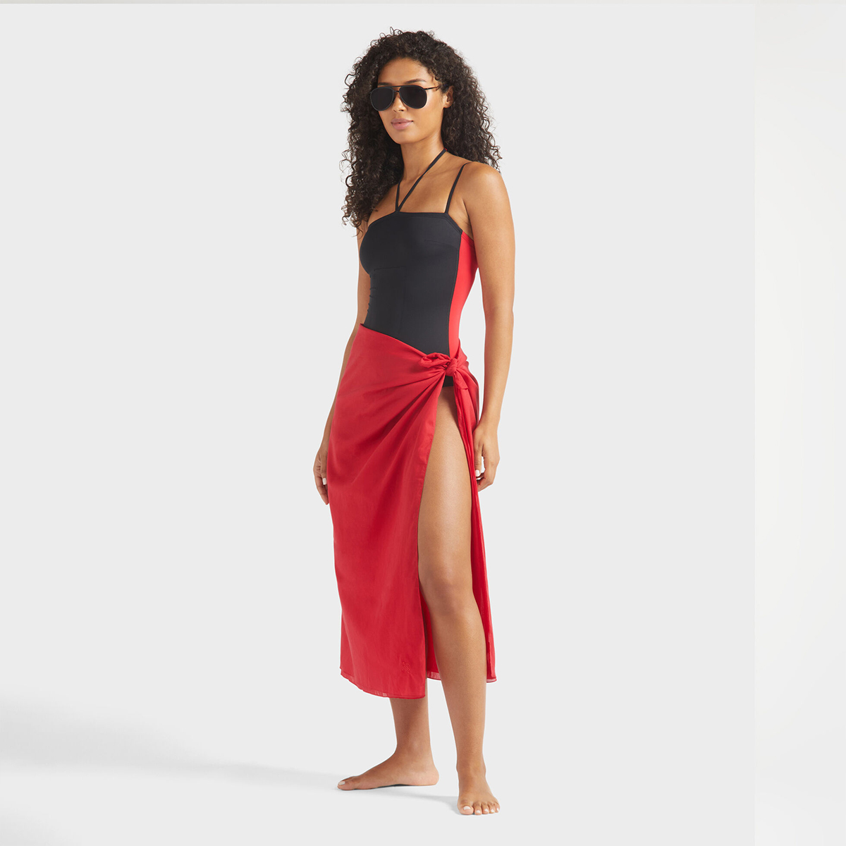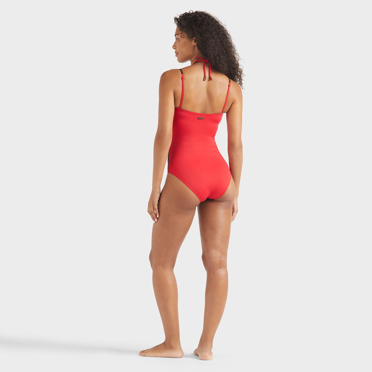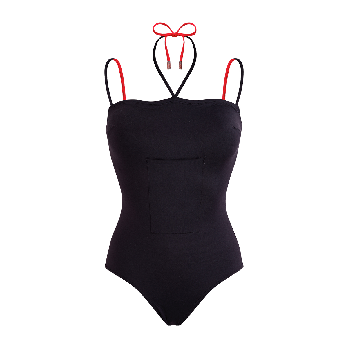 • İki renkli tek parça mayo: siyah ön ve ruj kırmızısı arka.