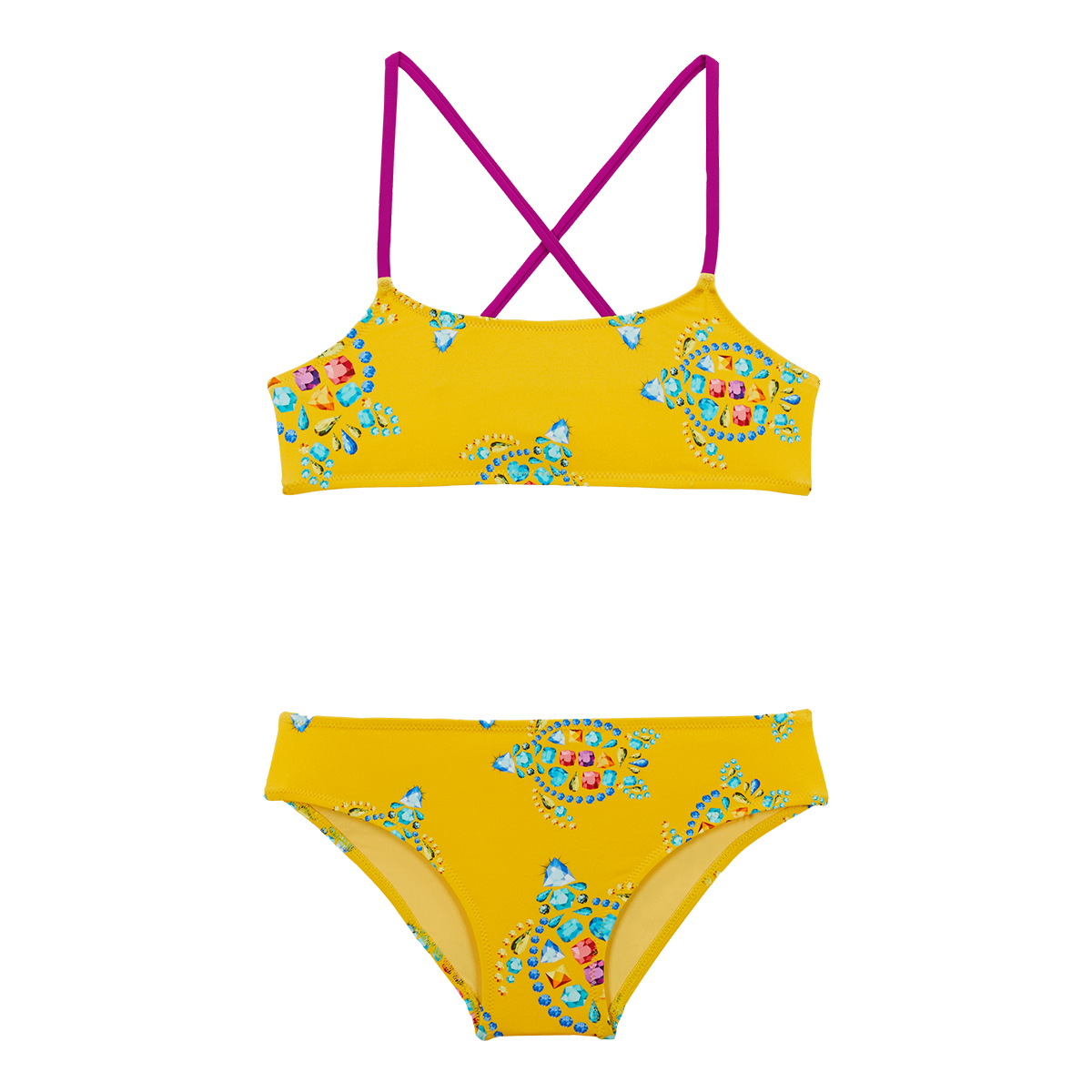 St. Tropez şıklığından ilham alan, çapraz sırt askılı ve geri dönüştürülmüş poliamid ve elastandan üretilen bu iki parçalı baskılı mayoyu küçük kızlar çok sevecek.